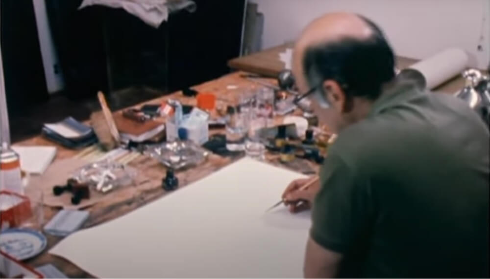 At the very beginning of the video we join Steinberg in his home studio as he starts one of his ink sketches. It's a simple scene that lasts only 30 seconds or so but it gives us a deep insight into the working methods of a man who regularly used rituals to fuel his creative process.